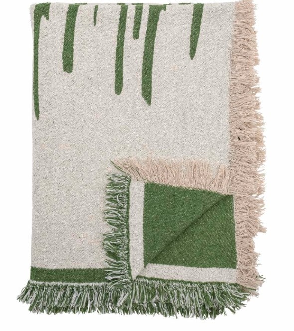 Die Haxby Decke von Bloomingville ist aus recycelter Baumwolle gewebt, mit gemütlichen Fransen an den Enden. Die Decke ist beidseitig mit einem schönen Muster in einem wunderschönen grünen und hellen Naturton.