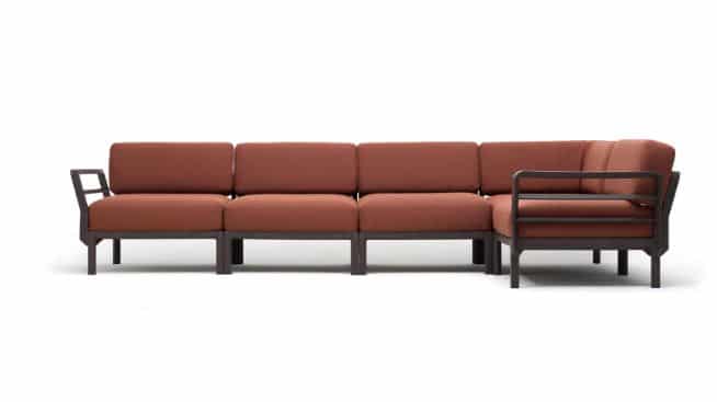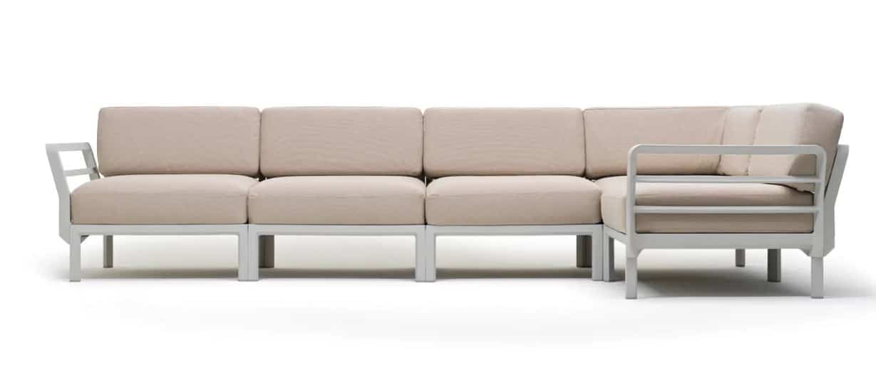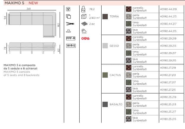 Modulares Polstermöbelsystem, das beliebig zusammengestellt werden kann.GESTELL: regeneriertem UV-beständigem fiberglass-Polypropylen*, voll durchgefärbt. Rückenlehne und Armlehnen können auf allen Seiten des Sitzes mit einem Befestigungssystem ohne Verwendung von Schrauben eingehängt werden.KISSEN: Abziehbarer/zip.Maximo 5 besteht aus 5 Sitzmodulen und 8 Rückenlehnen