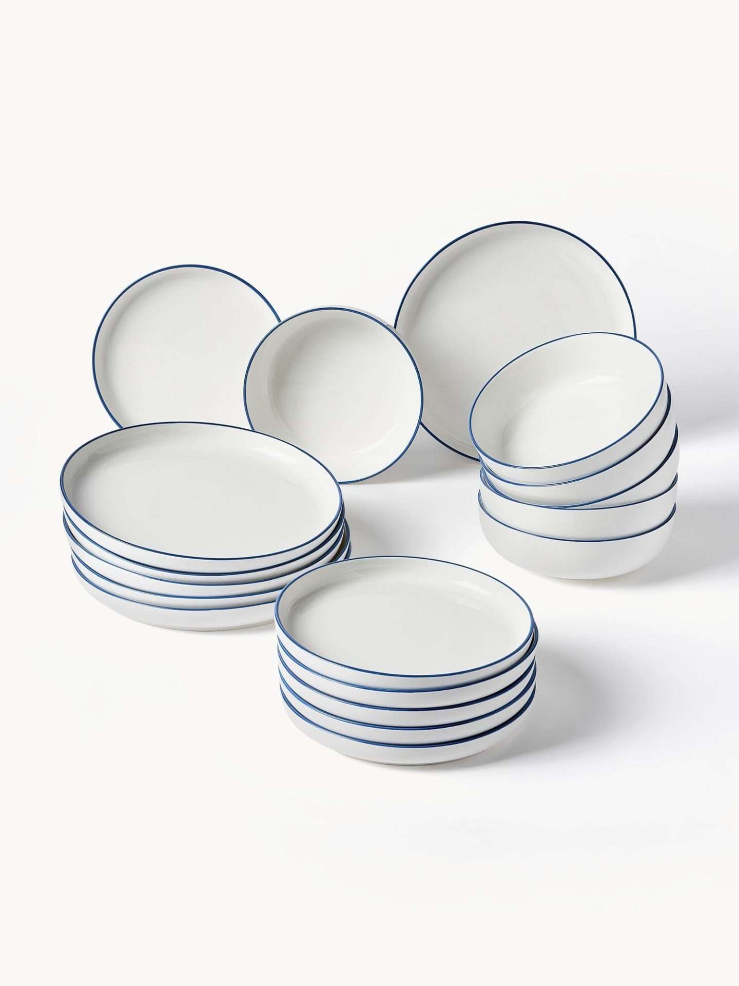 Dieses 18-teilige Geschirr-Set mit dunkelblauem Rand besteht aus 6 Speisetellern, 6 Suppentellern, und 6 Desserttellern.